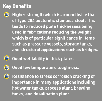 Duplex stainless has a microstructure which is split roughly 50:50 between austenite and ferrite and balancing of these phases provides benefits (see key benefits panel)