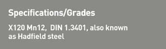 Specification X120 Mn12, DIN 1.3401, also known as Hadfield steel, work hardening steel offering a combination of wear resistance and low temperature toughness.