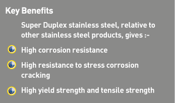 As a part of the Duplex family of stainless steels Super Duplex stainless has a microstructure which is split roughly 50:50 between austenite and ferrite. It differs from Duplex in its chemical composition (with increased amounts of Molybdenum, Nickel, and Chromium) and its mechanical properties (higher proof stress and tensile strength). This highly alloyed product is especially designed for marine, chemical, and oil engineering applications requiring both high mechanical strength and resistance to corrosion in extremely aggressive environments (chloride-containing acids etc.).